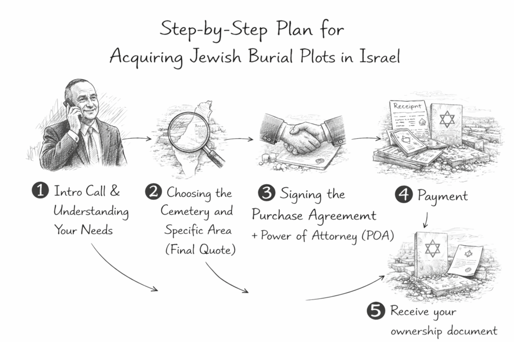 The POA authorizes us to act on your behalf in Israel to acquire the plot directly from the cemetery and complete the required formalities—especially helpful for clients abroad.