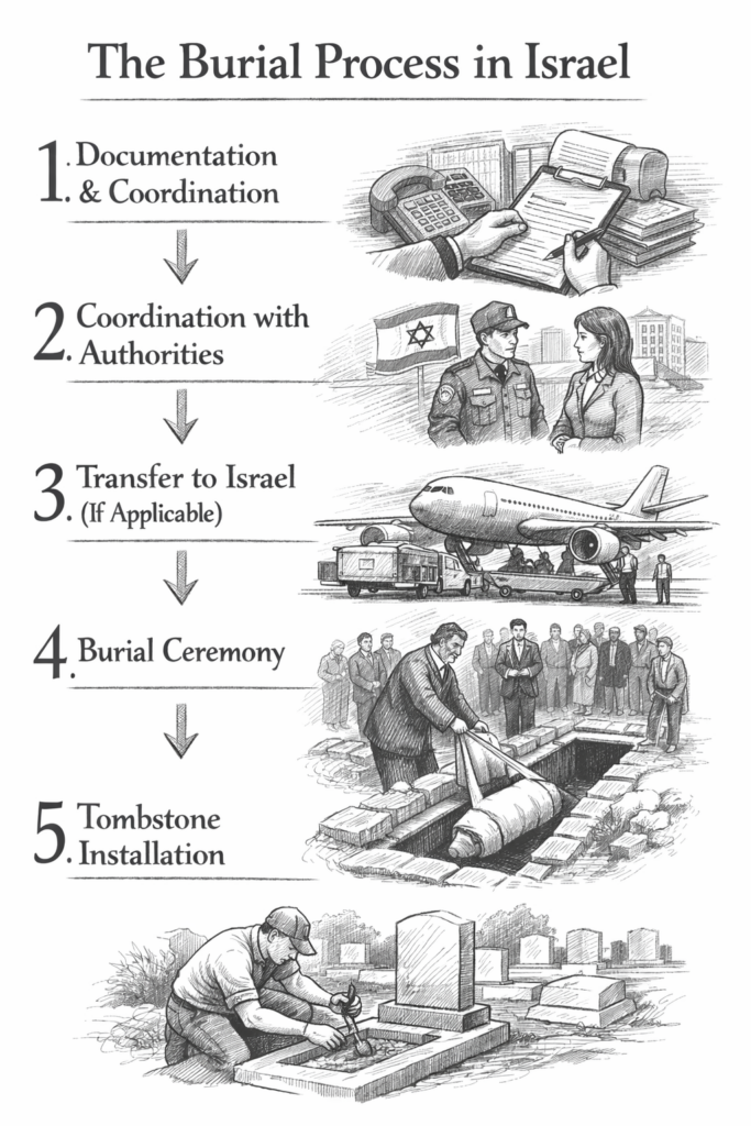 If death occurs overseas, the deceased can be transferred to Israel for burial. The process includes: