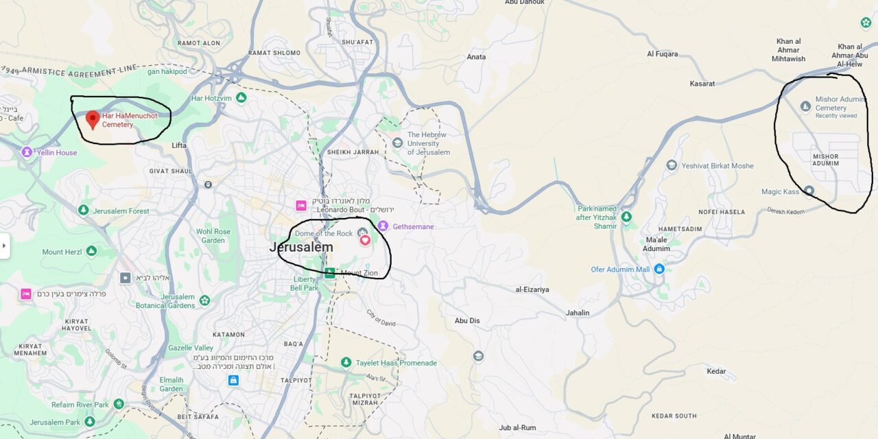 Derech HaChaim  cemetery is located about 8 km from Jerusalem.  In the map you can see marked on the right the Derech HaChaim cemetery. In the middle is the Temple Mount, and on the left is the central cemetery of Jerusalem (Har Hamenuchot Cemetery).